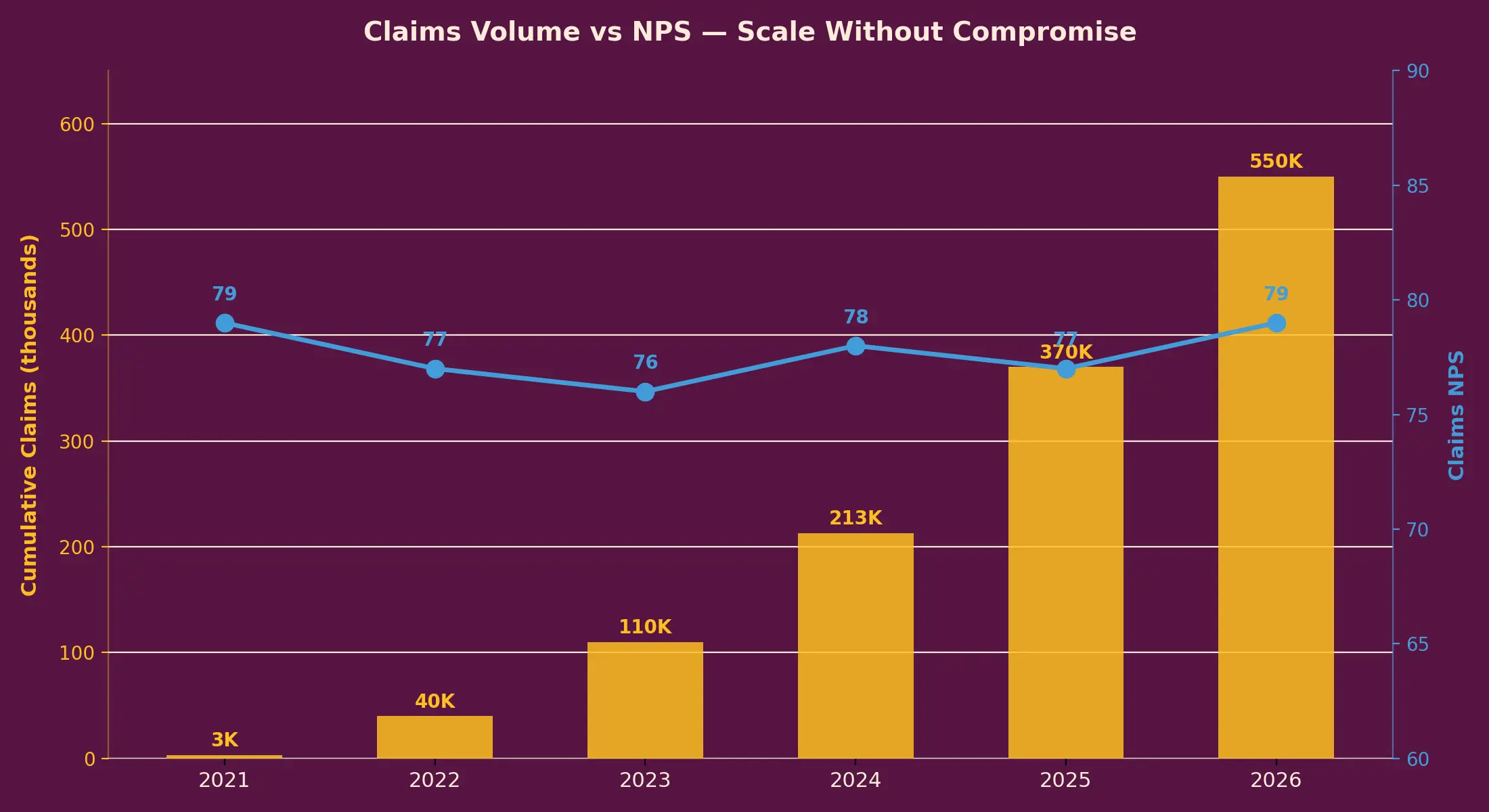 We are incredibly proud of our NPS which stands at an industry-leading 79. What makes it better is that we’ve stayed on this score despite scaling 60x in the number of claims processed.